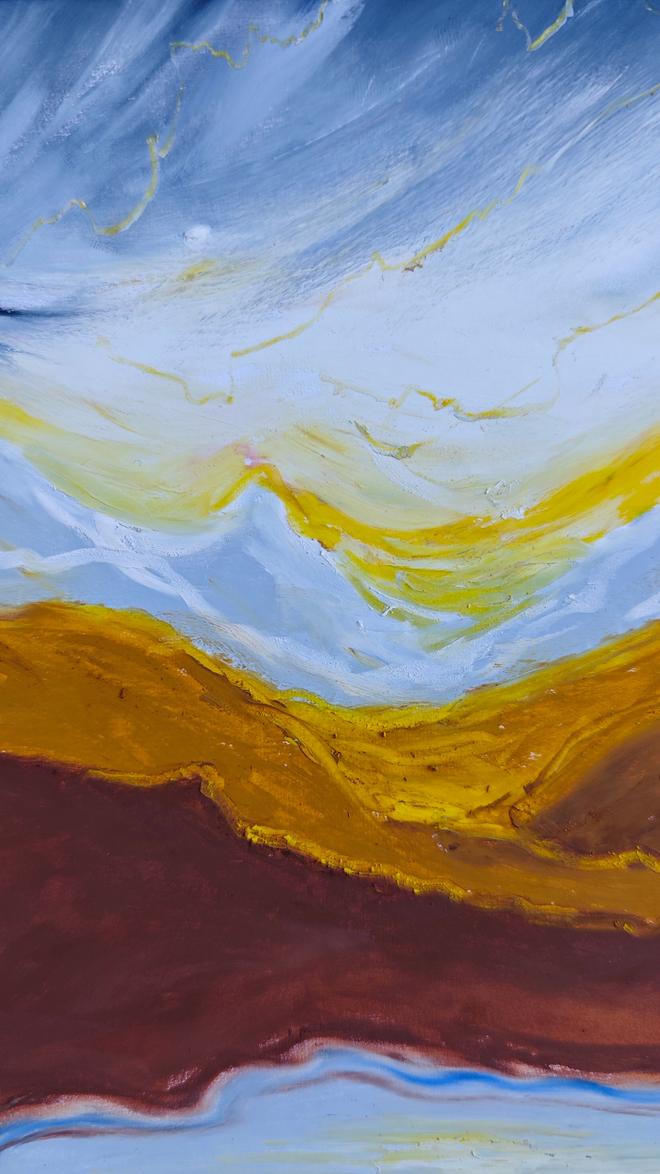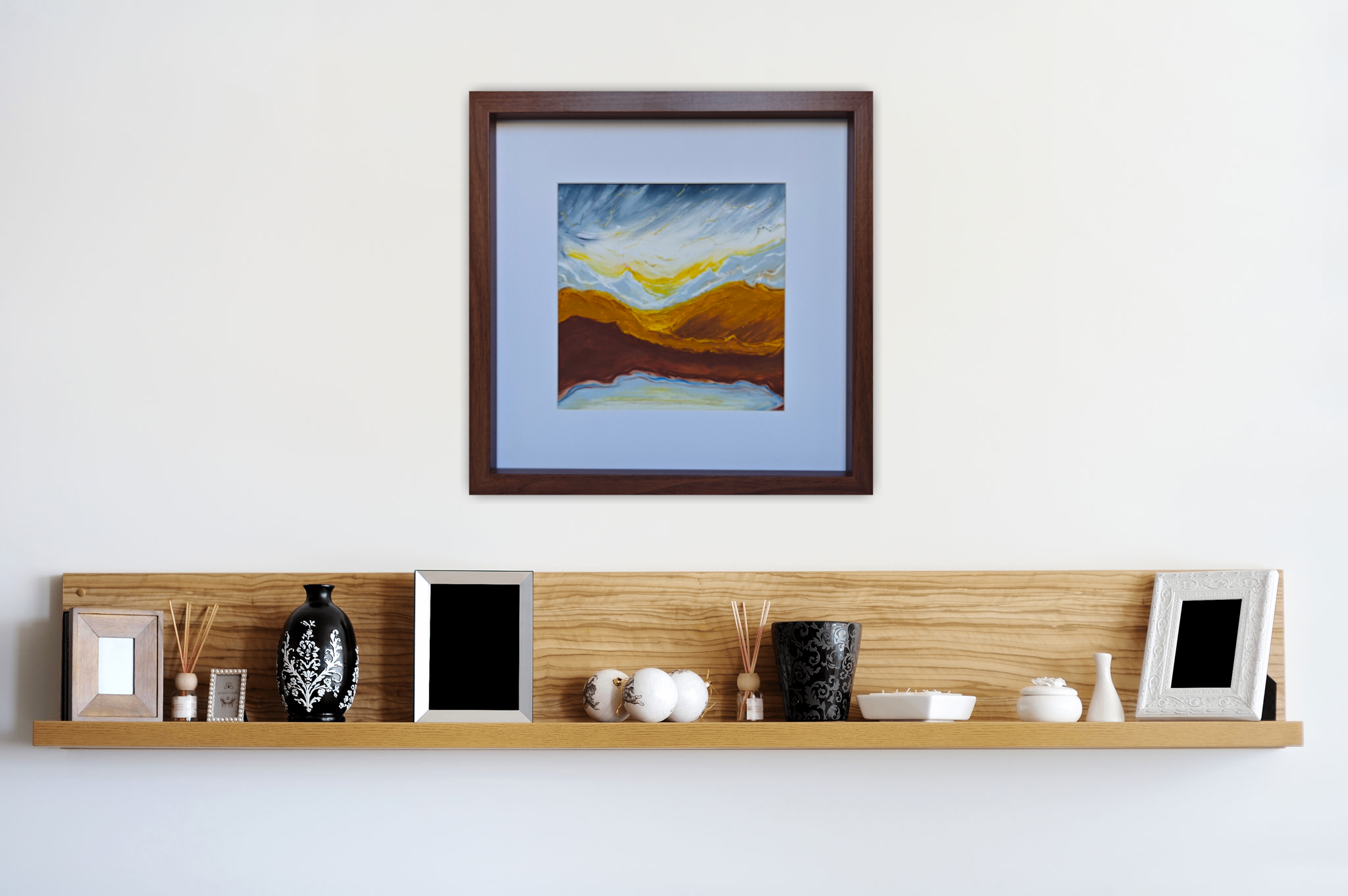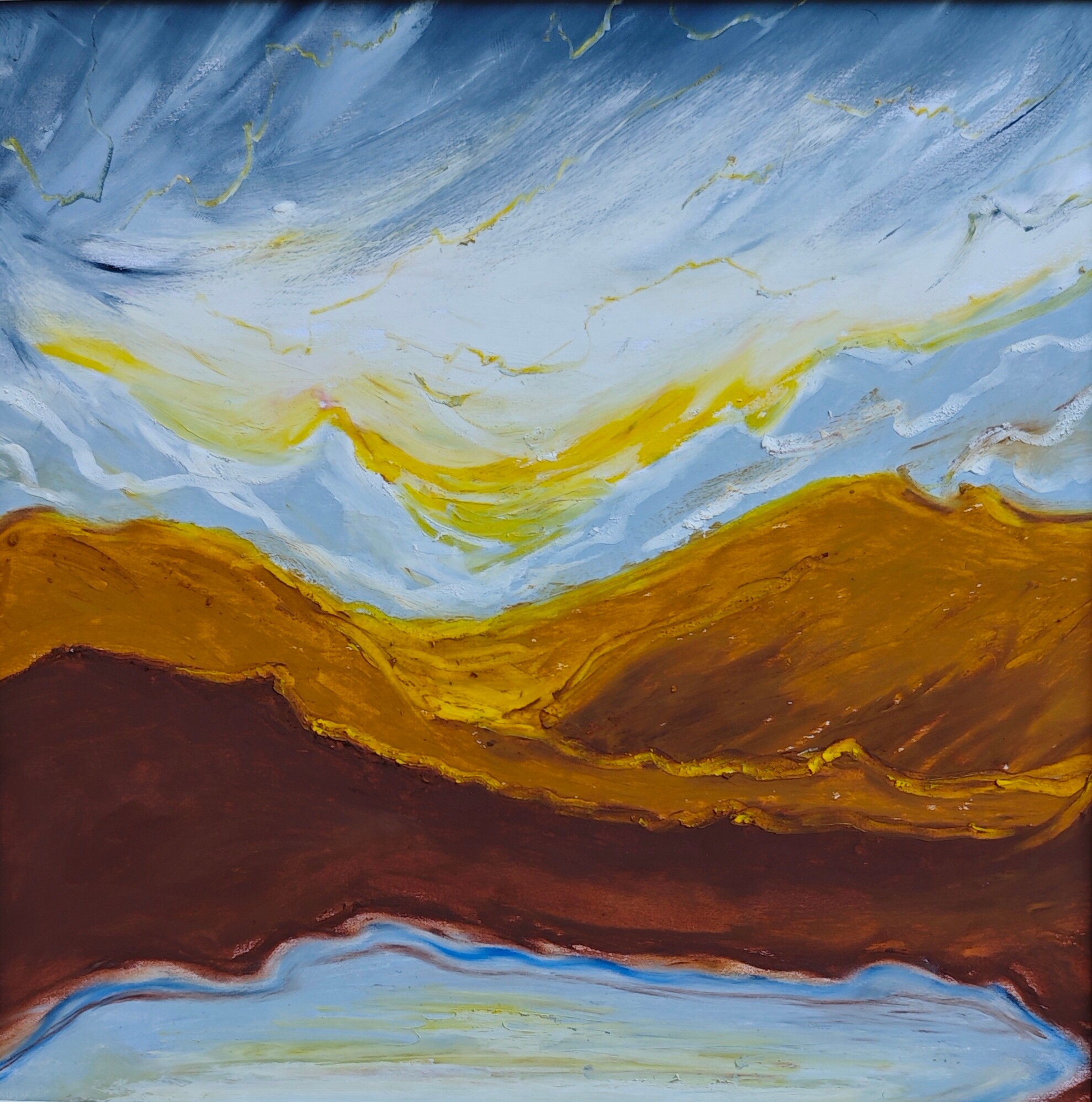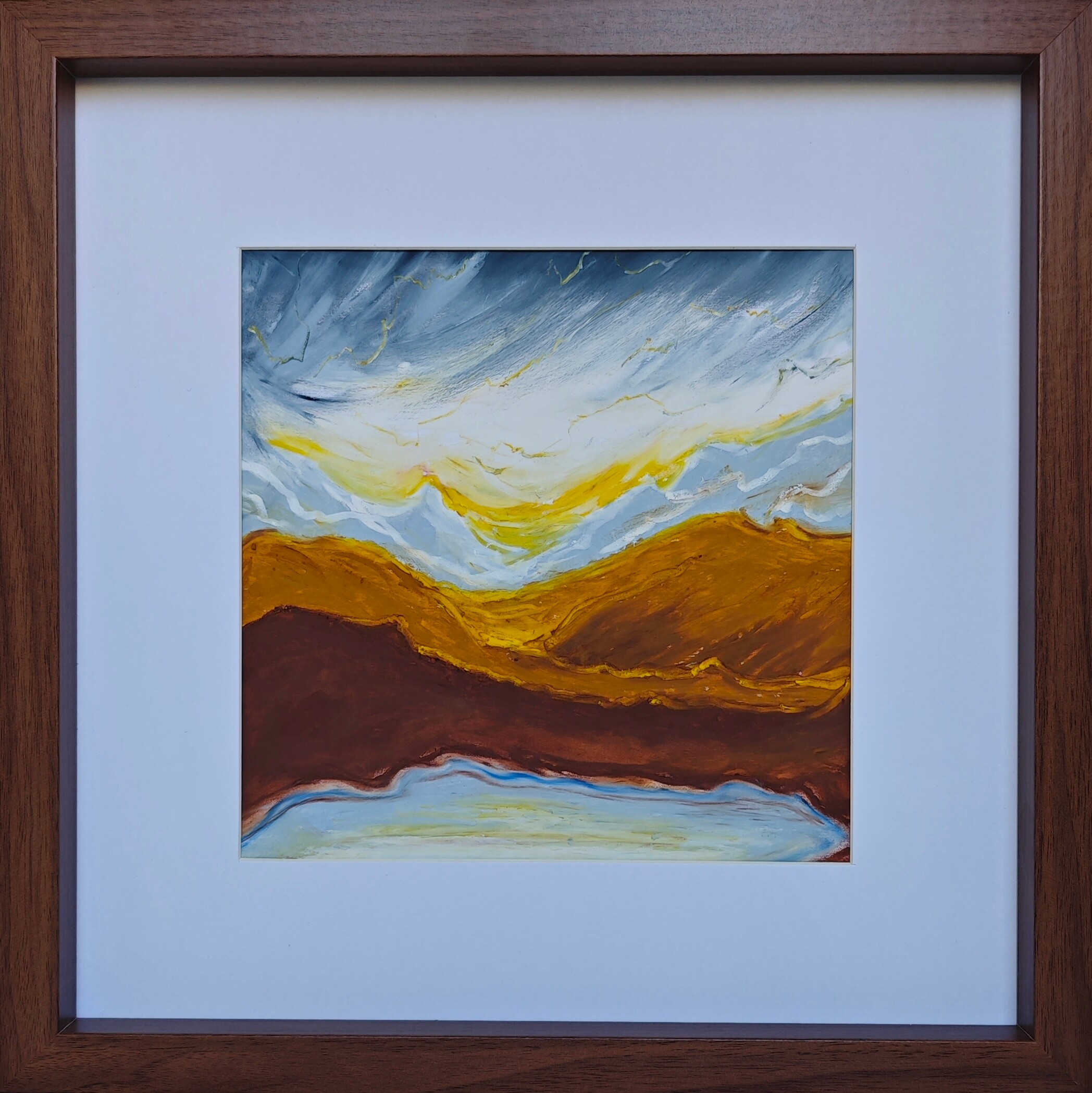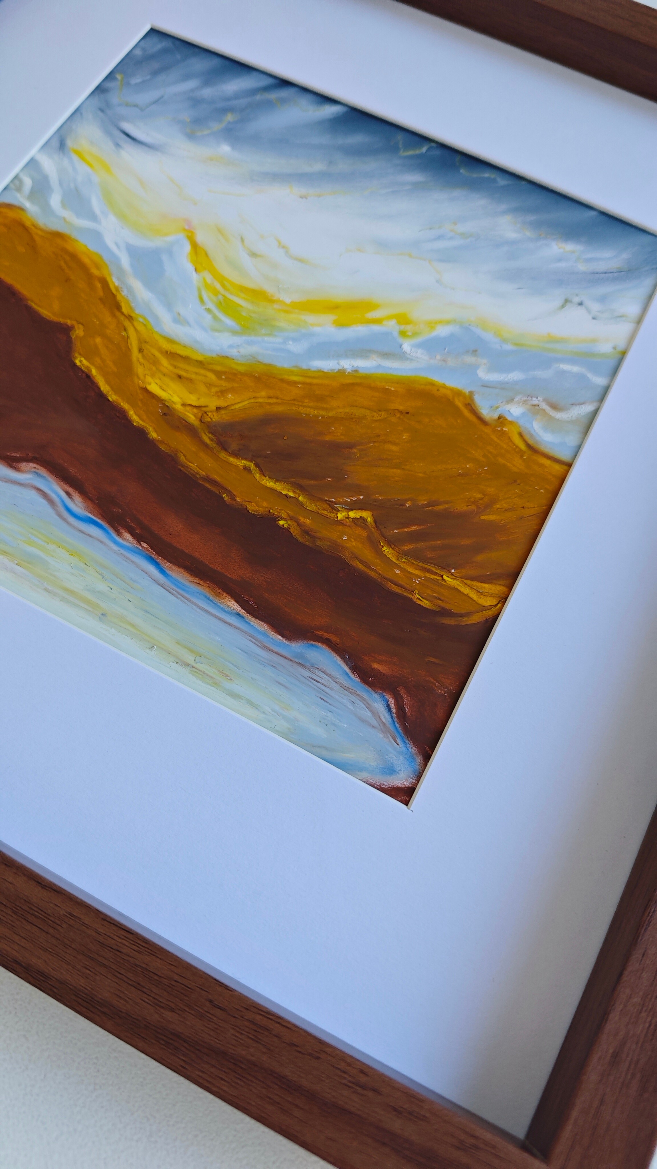 The painting “Aurea Terra” was created using oil pastels on paper. The whole piece is presented in a passe-partout and a beautiful frame with a glass front.