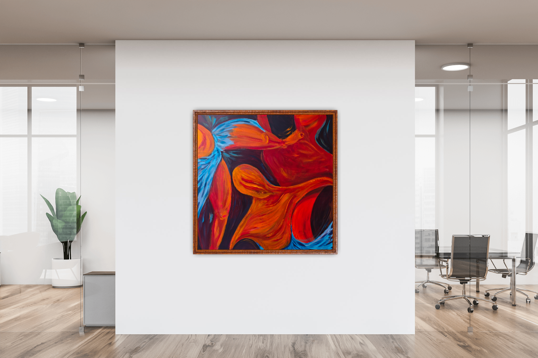 Painting "Dance" is made on a cotton canvas with acrylic paint. Everything is in motion. Bodies are trembling. Orange is vibrating with life.