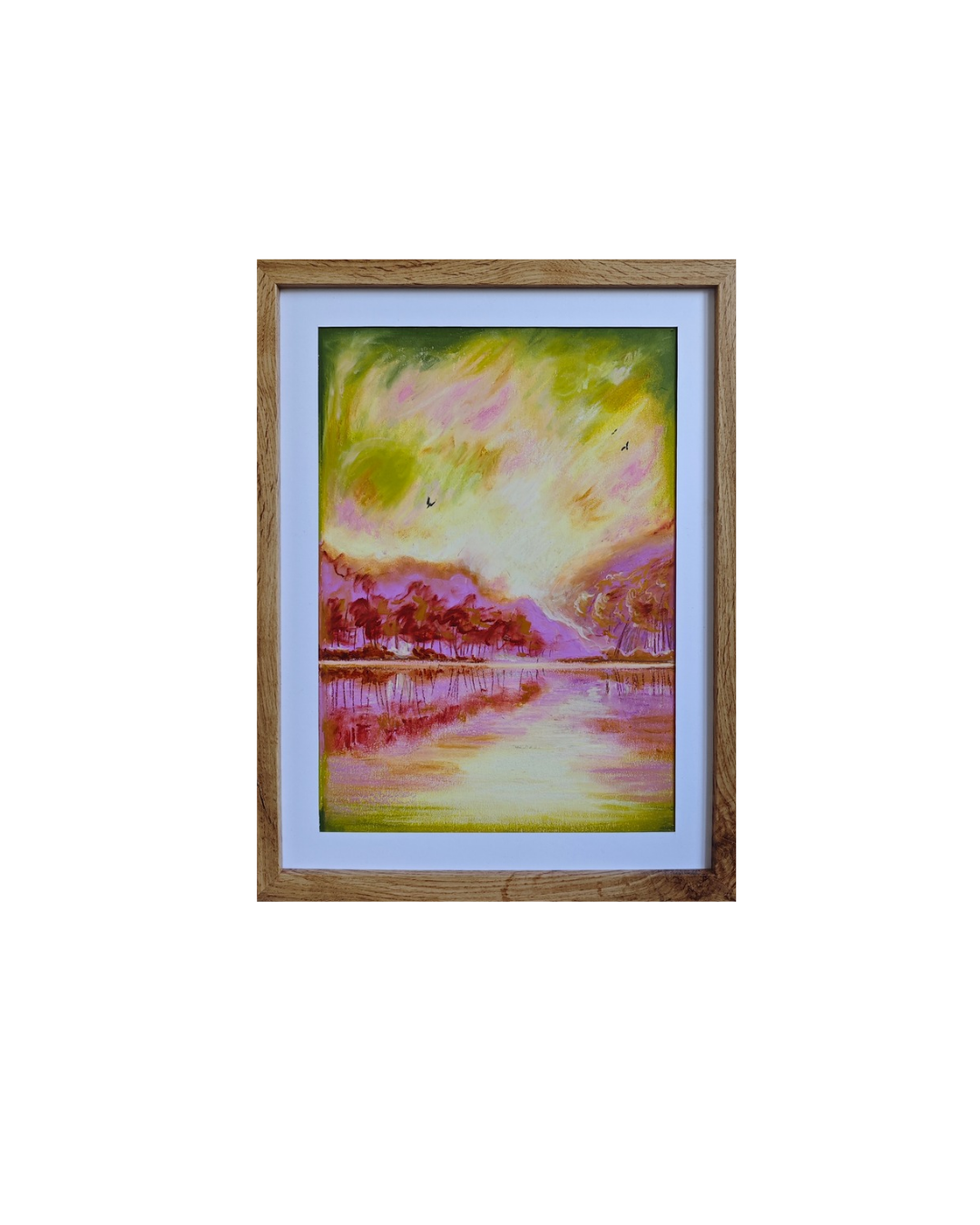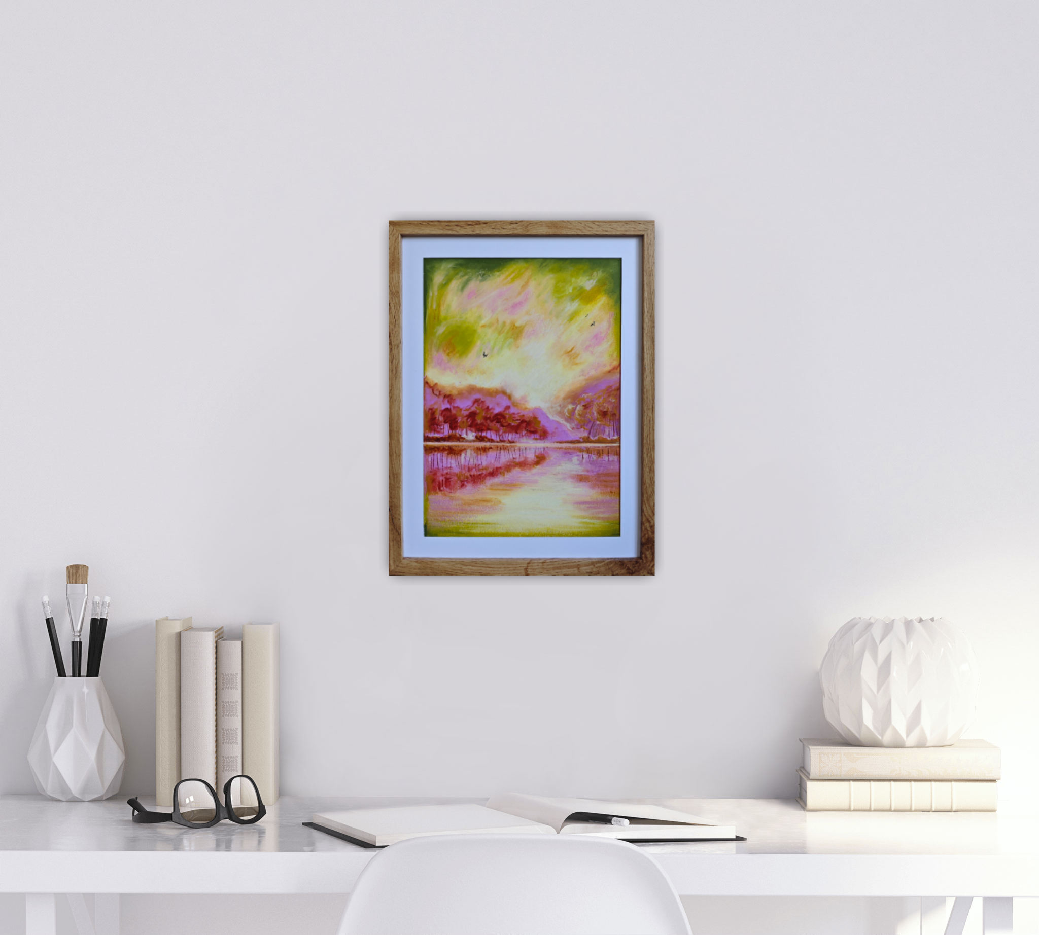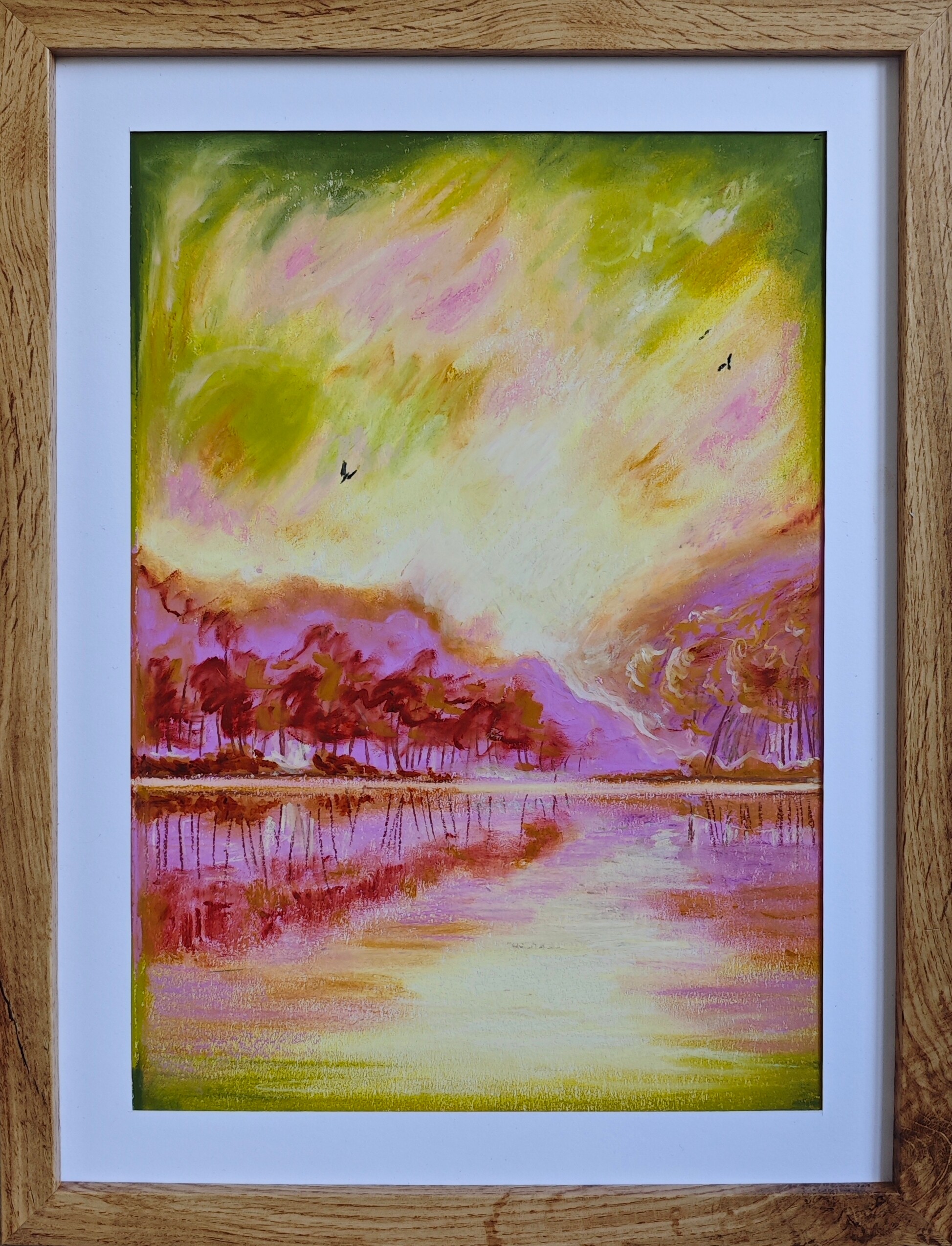The painting “Spring” was created using oil pastels on a cardboard. The whole piece is presented in a passe-partout and a beautiful frame with a plexiglass front.