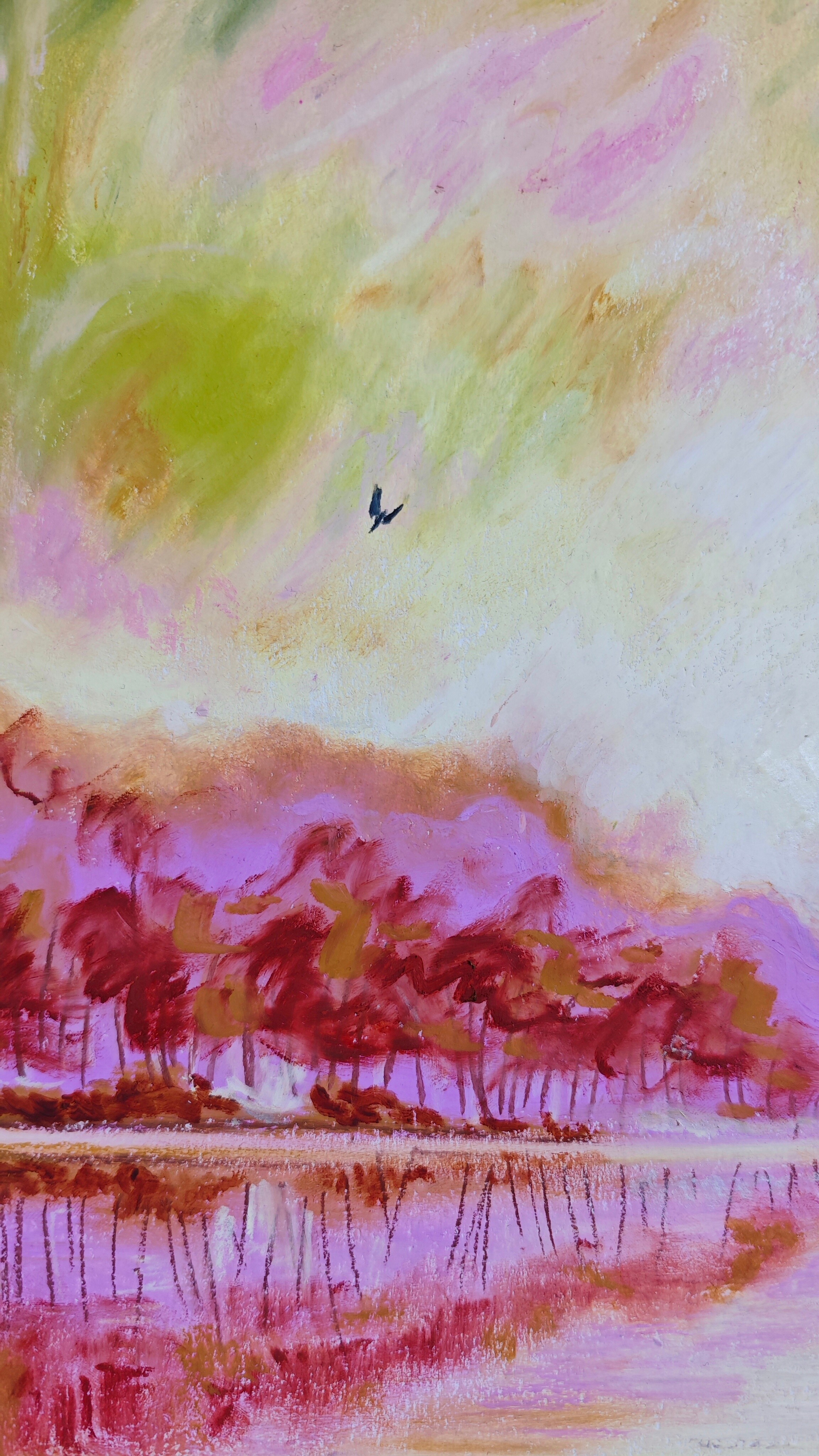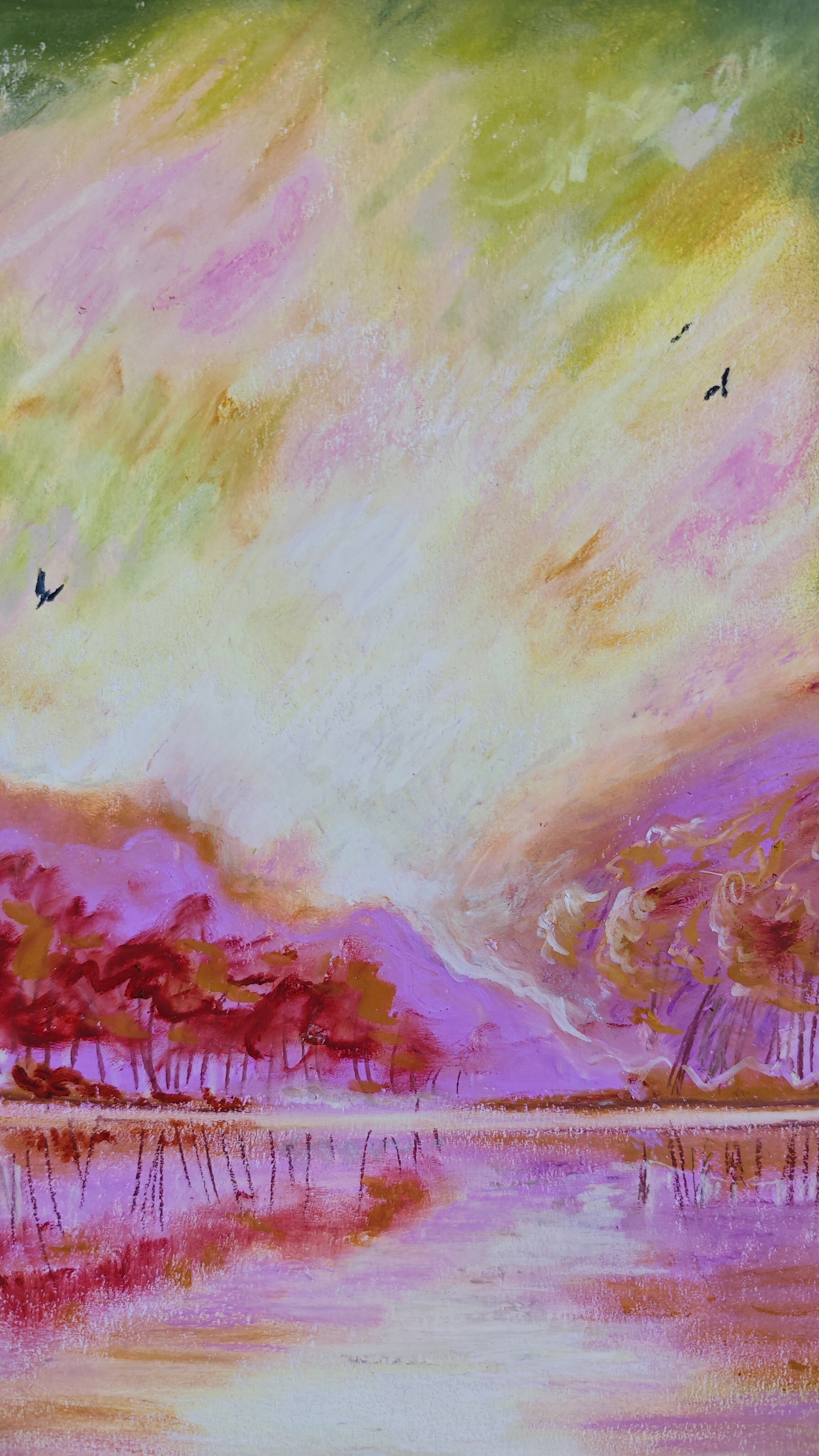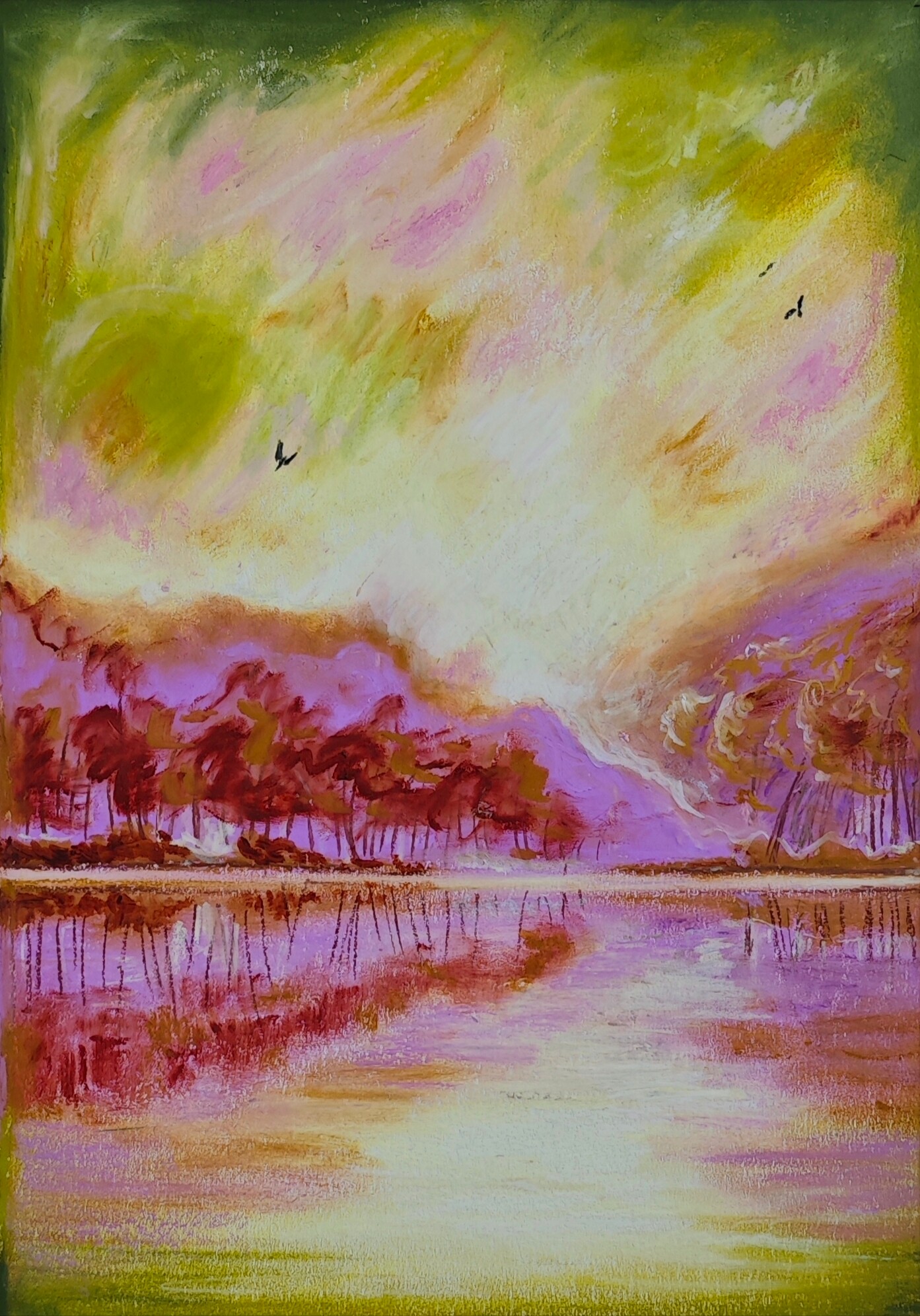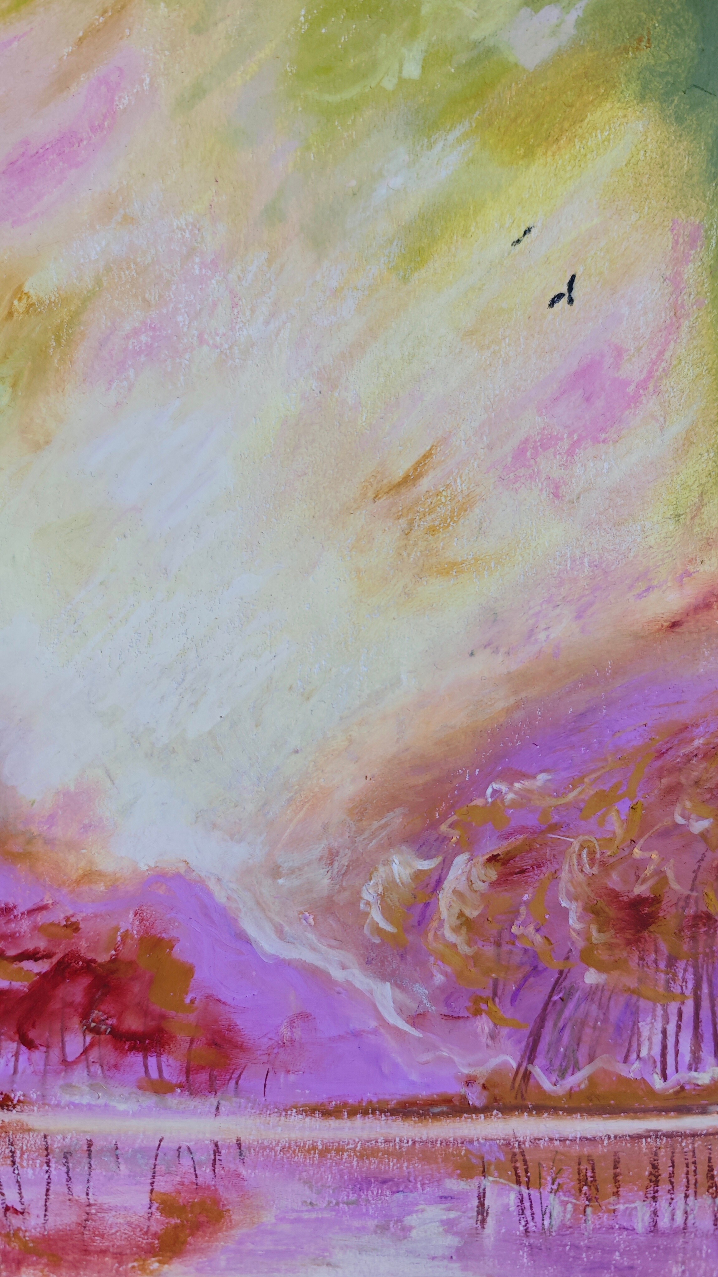 The painting “Spring” was created using oil pastels on a cardboard. The whole piece is presented in a passe-partout and a beautiful frame with a plexiglass front.