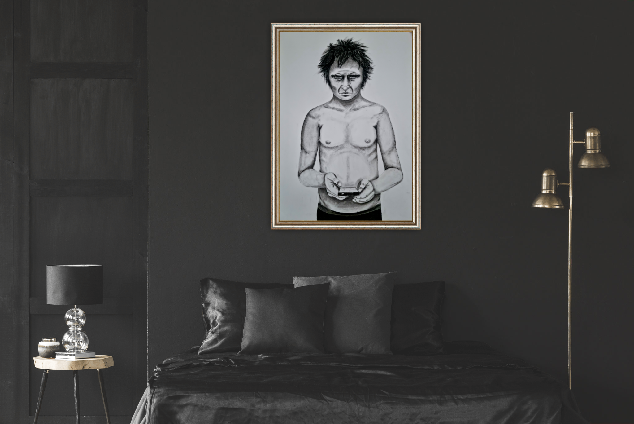 Drawing „The telephone” is made on the 450g paper with charcoal and pencils. A telephone – small thing, but so consuming. Emotions are being brought to emoticons. In this virtual world we can be anyone, even heroes of our fate. In real life we are naked.