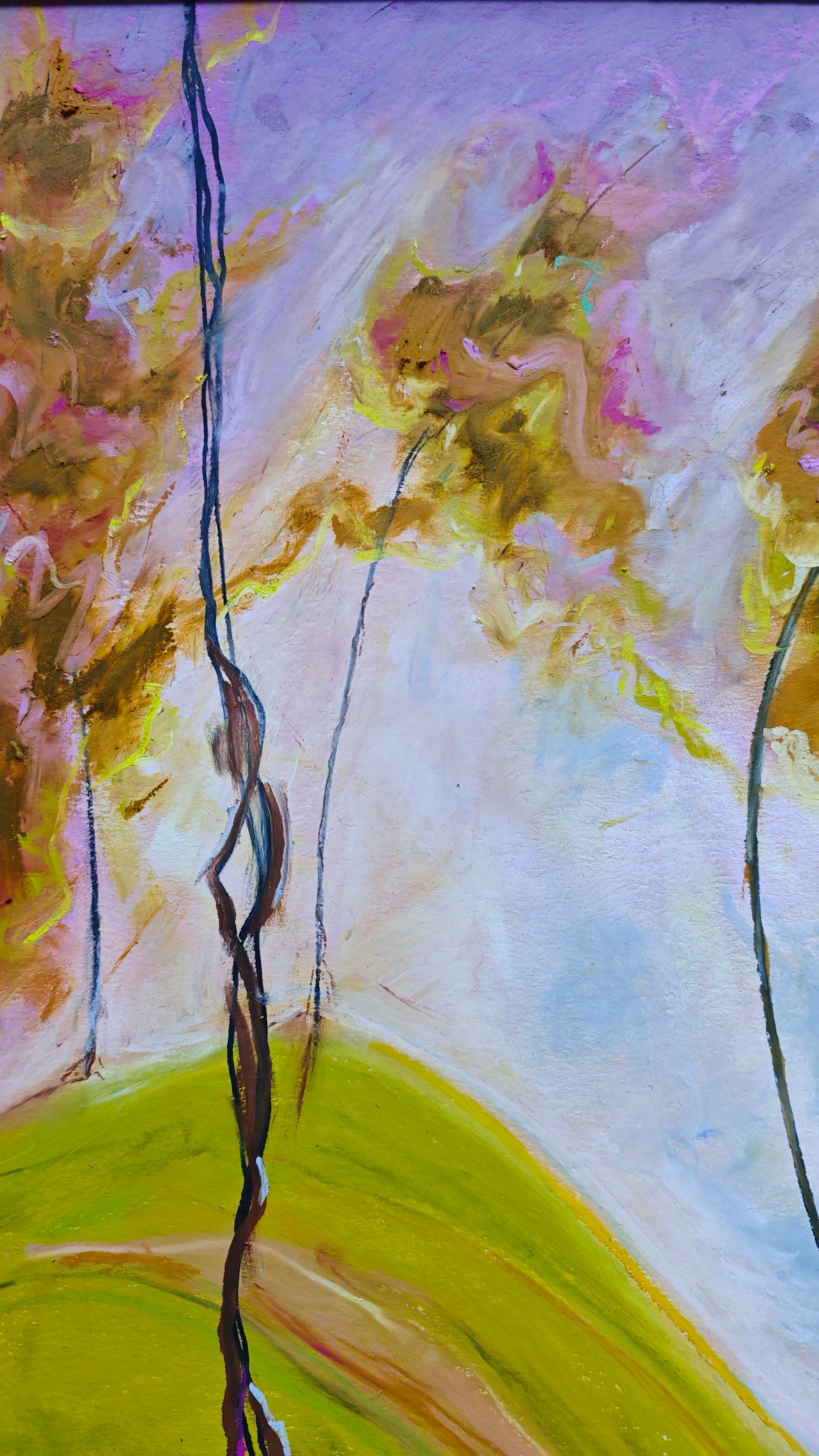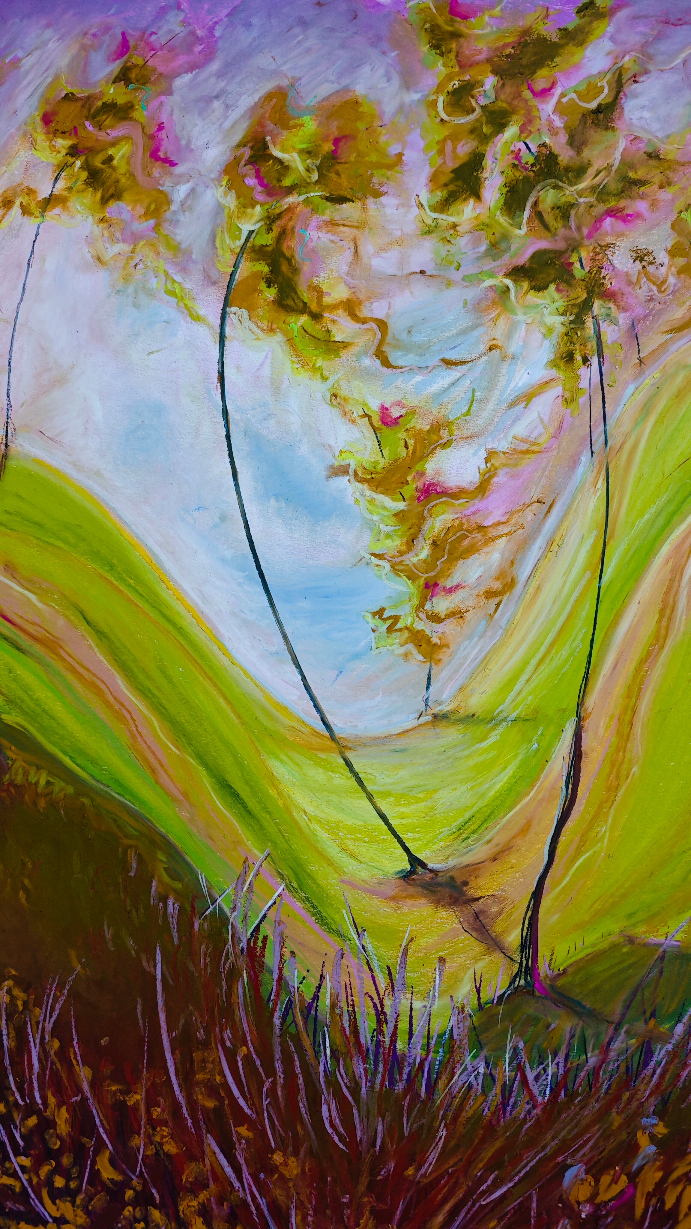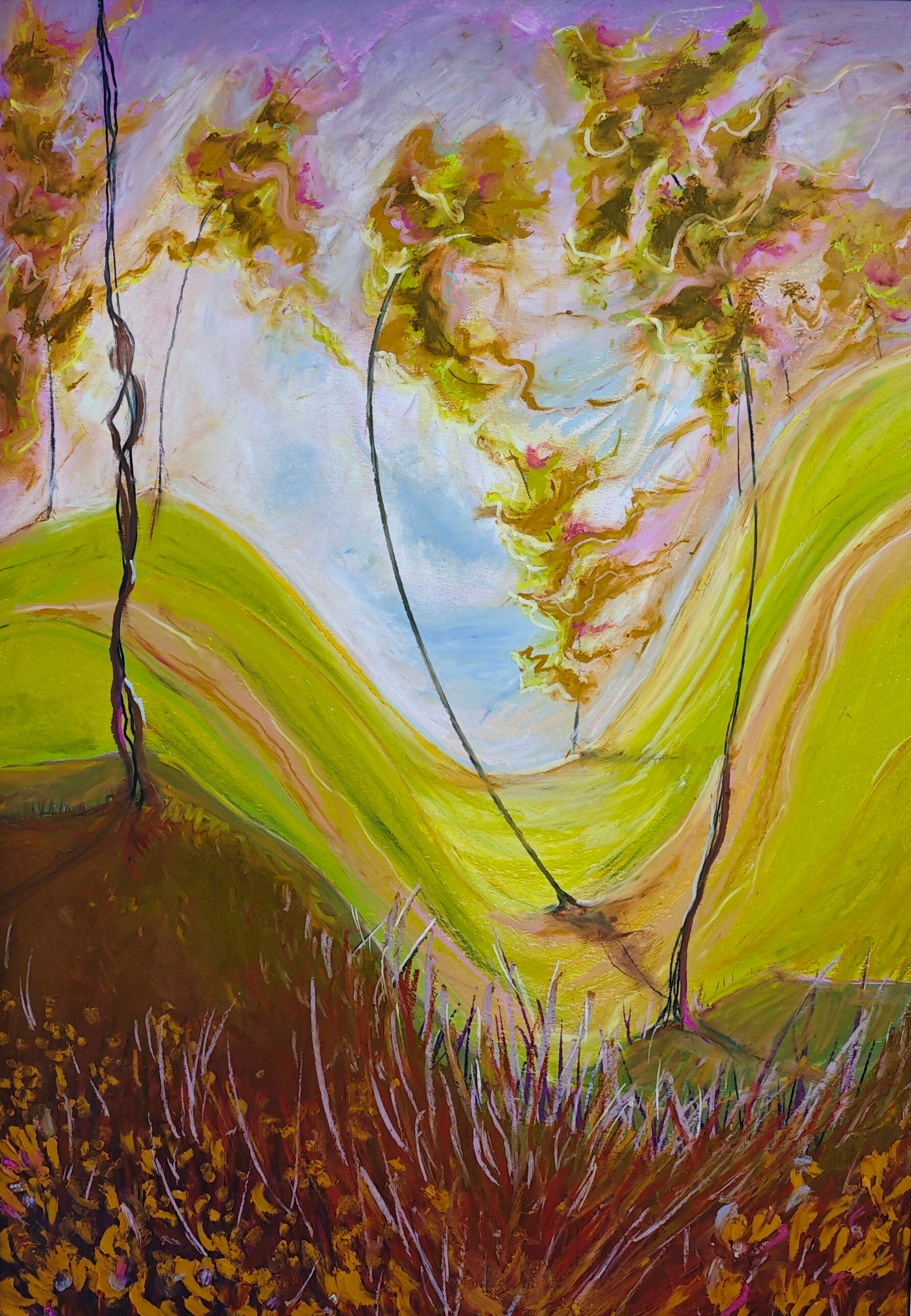 Obraz "Gdy drzewa tańczą" wykonałam pastelami olejnymi na tekturze introligatorskiej. Całość prezentowana jest w passe partout oraz pięknej ramie pod plexi.