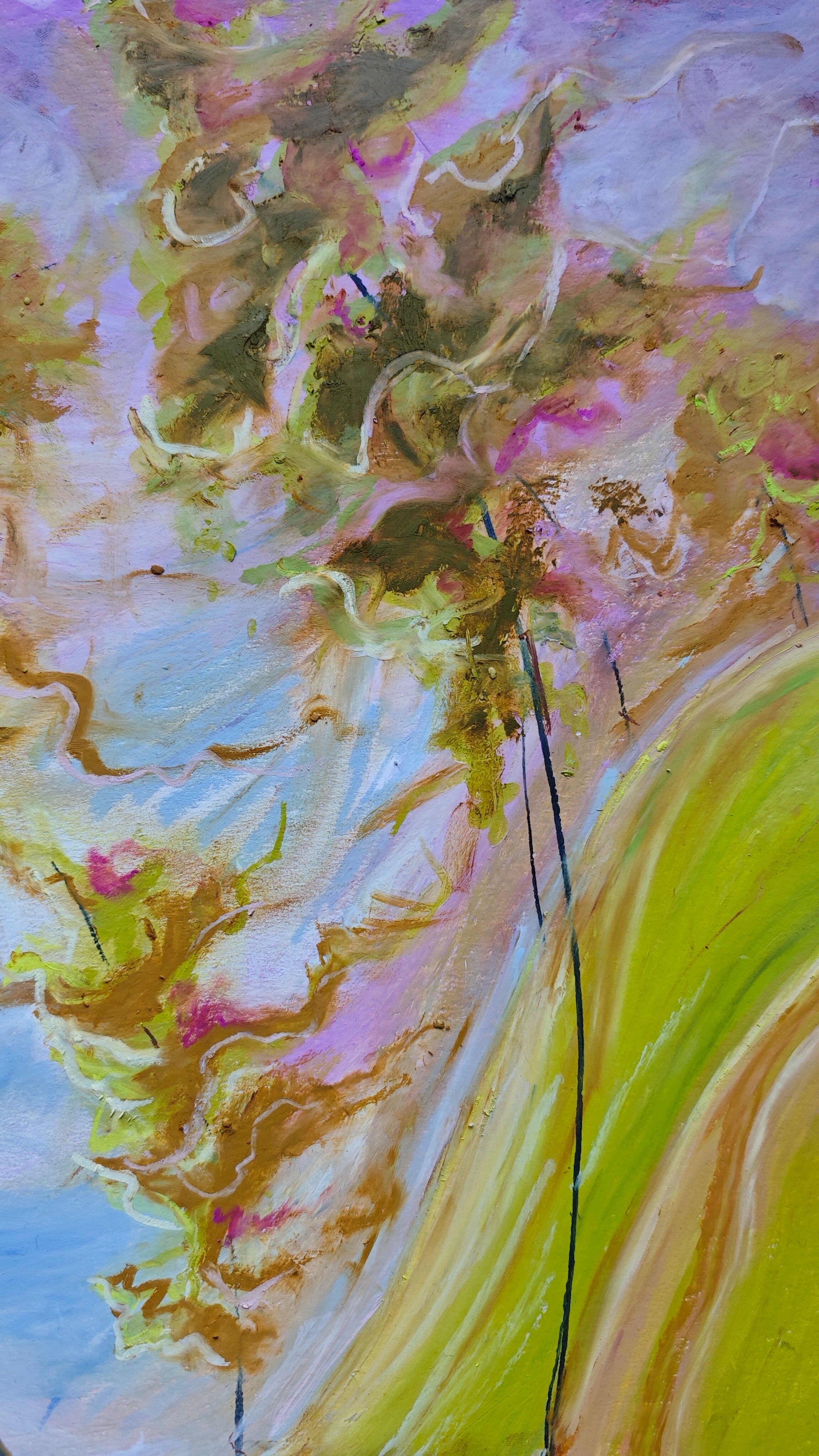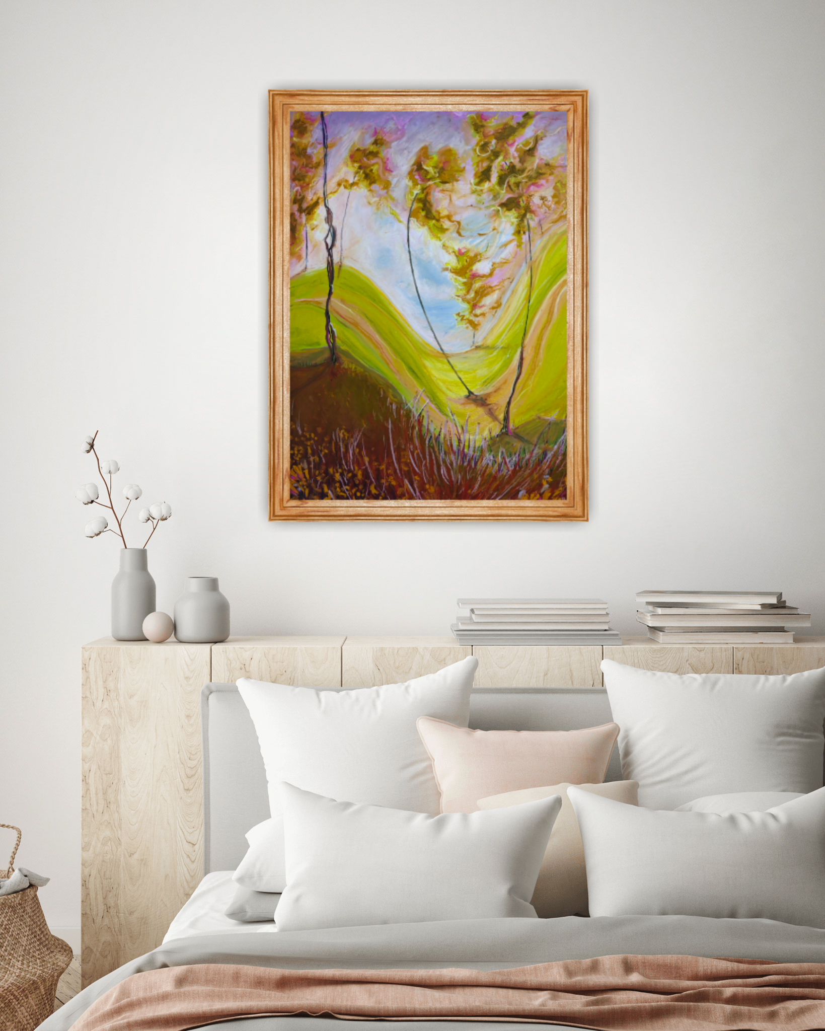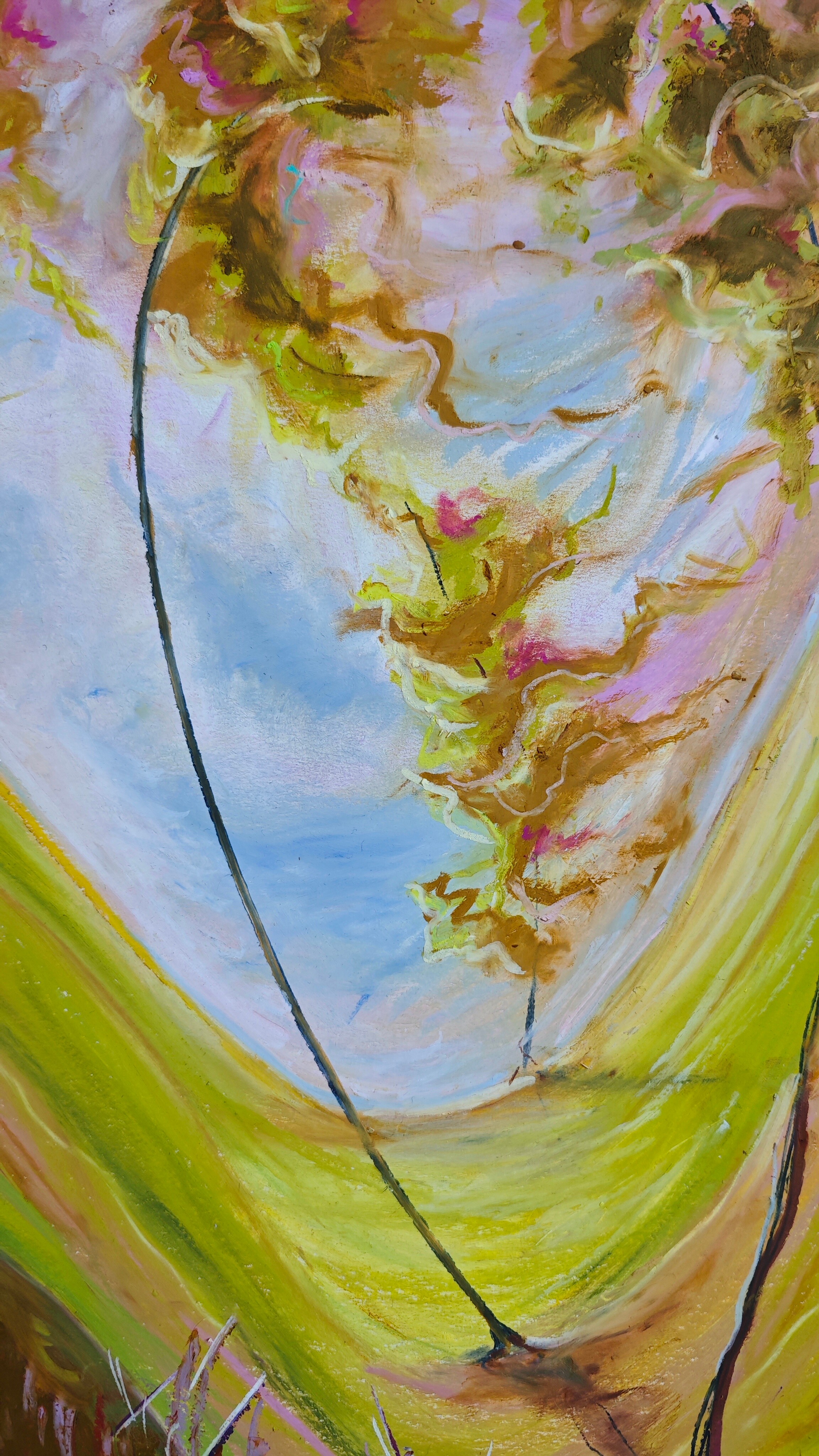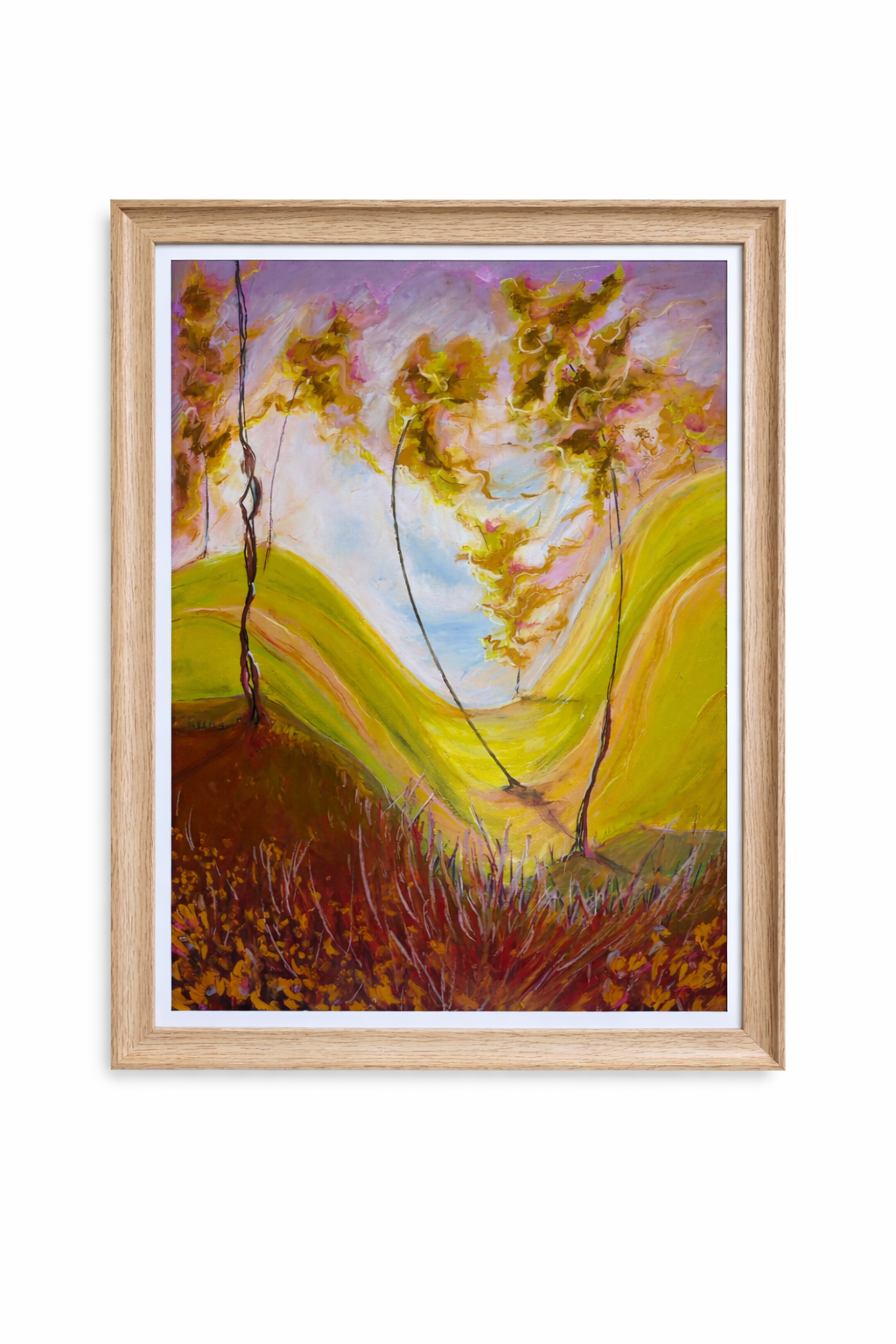 Obraz "Gdy drzewa tańczą" wykonałam pastelami olejnymi na tekturze introligatorskiej. Całość prezentowana jest w passe partout oraz pięknej ramie pod plexi.