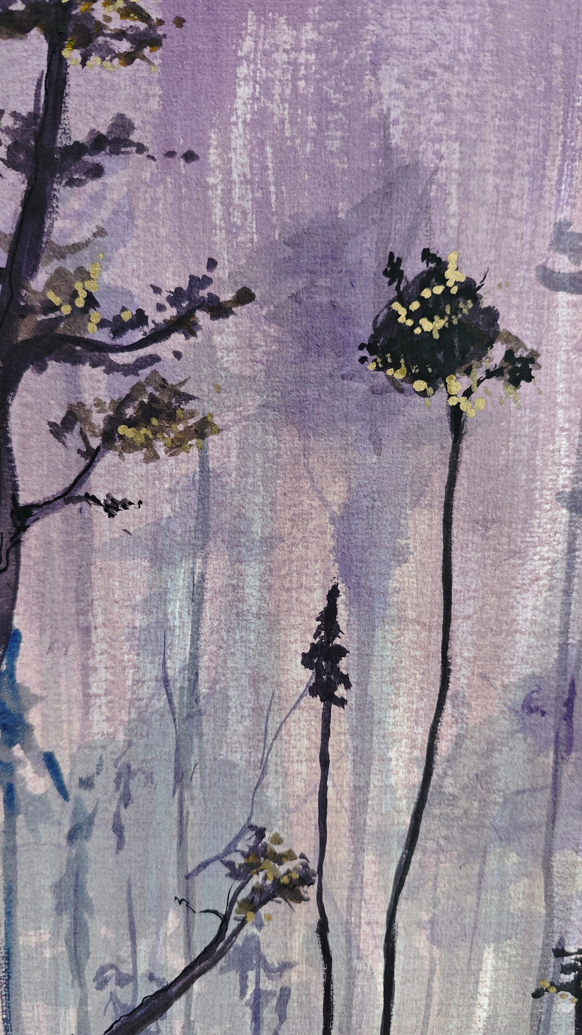 "Misty forest" wykonałam akwarelami na bawełnie. W tym obrazie odnajdziesz ciszę, zapach lasu, mgły i spokój. We fioletach i pomarańczach tańczy światło.